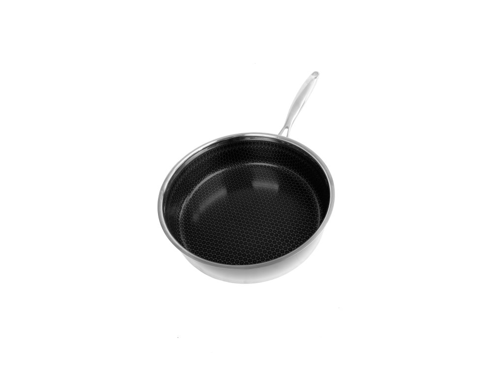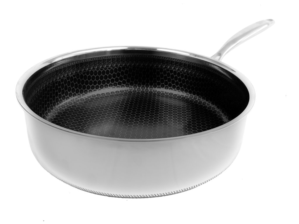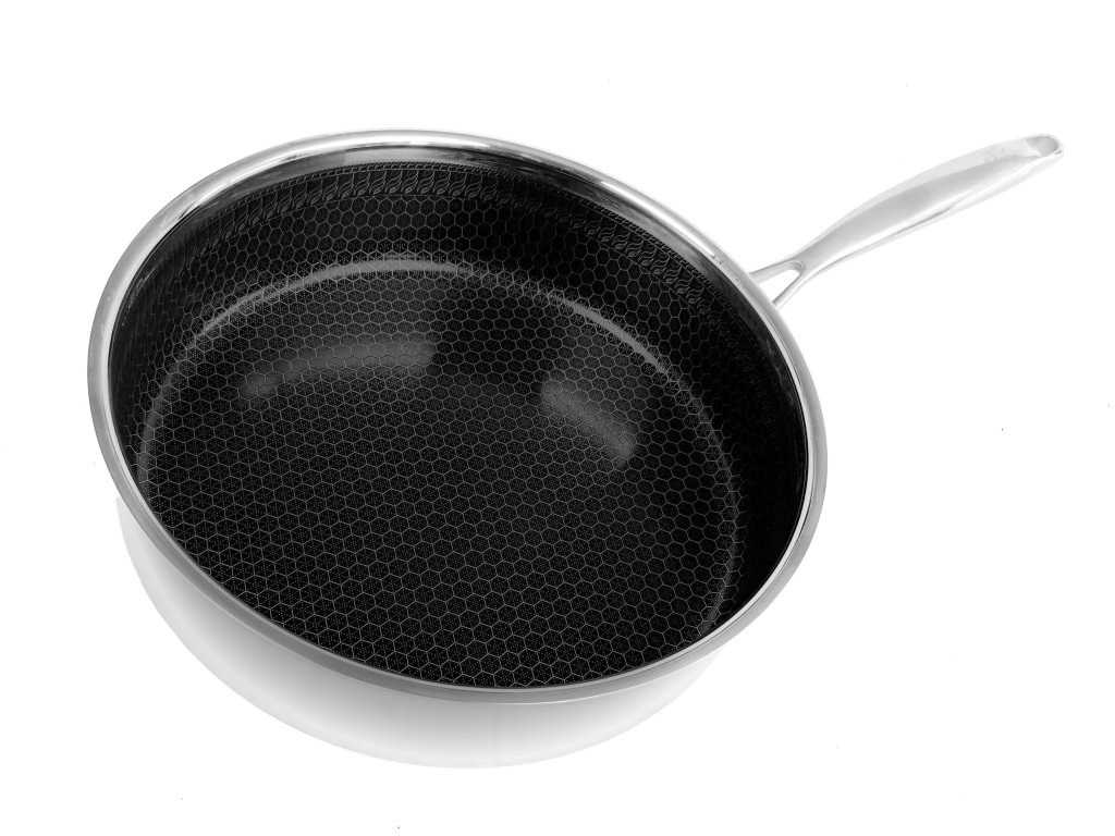 Delší životnost než běžné nepřilnavé pánve – hybridní technologie spojuje odolnost nerezu s komfortem nepřilnavého povrchu.