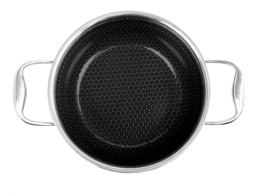 Spojení struktury nerezové oceli s nepřilnavou technologií nové generace. Odolný proti poškrábání, vhodný i pro kovové náčiní. Připékání nemá šanci. -