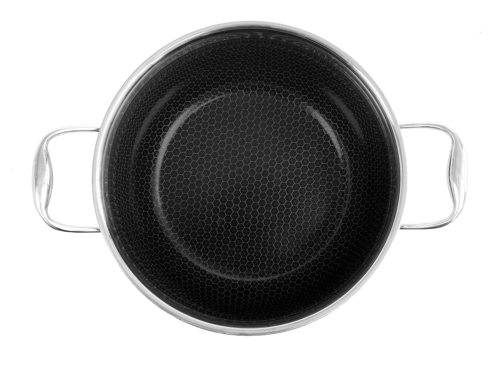 Spojení struktury nerezové oceli s nepřilnavou technologií nové generace. Odolný proti poškrábání, vhodný i pro kovové náčiní. Připékání nemá šanci. -